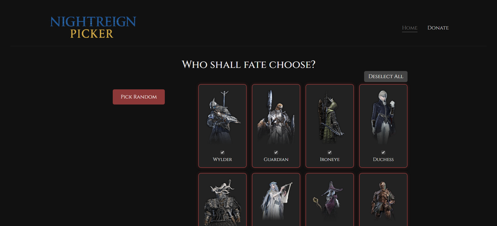 Nightreign Picker, Elden Ring Nightreign için geliştirilen basit bir web tabanlı widget’tır. Oyuncuların oyundaki karakterlerden rastgele seçim yapabilmesini sağlar.
