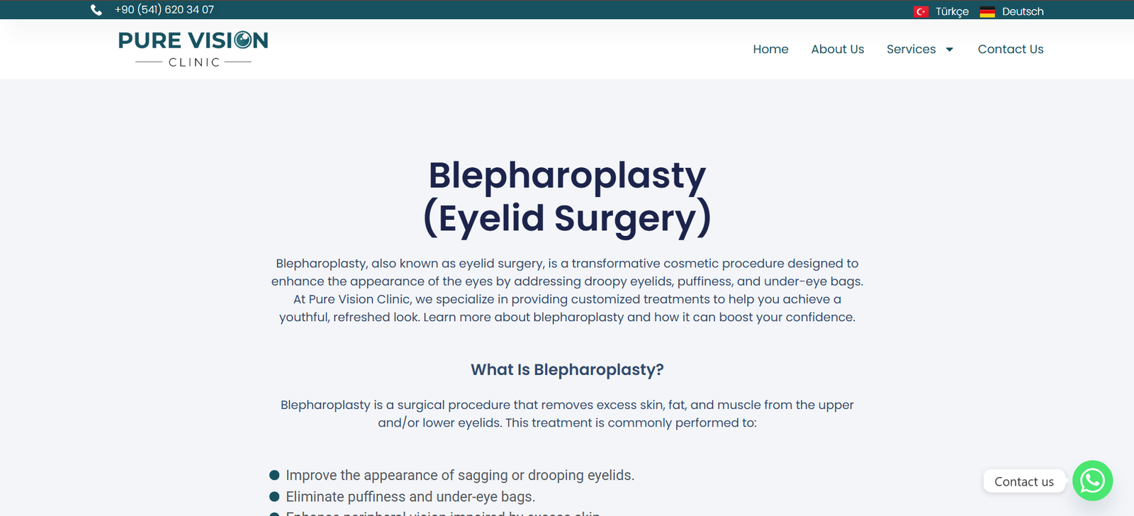 Proje kapsamında web sitesi yeniden tasarlandı, çok dilli yapı entegre edildi ve SEO uyumlu içerik düzeni oluşturuldu. Klinik hizmet sayfaları arama motoru optimizasyonuna uygun şekilde düzenlenerek uluslararası kullanıcı deneyimi geliştirildi. Böylece Pure Vision Clinic daha güçlü bir çevrimiçi varlık elde etti.